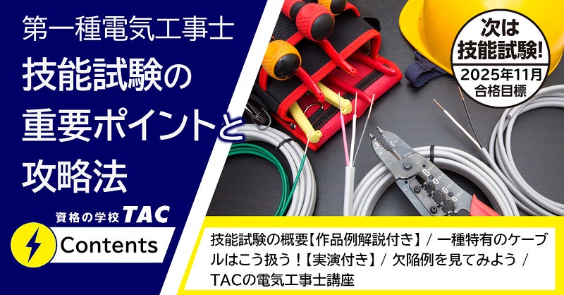 電気工事士試験対策講座を展開しているTAC株式会社(東京都千代田区、代表取締役:多田敏男)は2025年10月5日(日)に実施される『令和7年度下期 第一種電気工事士試験』の難易度分析や講評、解法などを解説する試験講評を、10月9日(木)にTACのWebサイトで公開いたします。さらに!11月の技能試験攻略のポイントを実演を交えてお伝えするWebセミナーを公開中です。