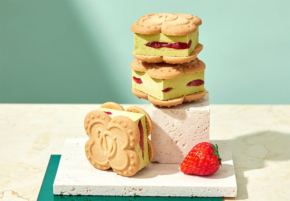 素晴らしい香りが特徴の苺「サンアンドレアス種」の果肉を苺のピューレで煮込んで仕立てた、苺本来の甘みと酸味を味わえる苺コンフィチュールジュレ。コク濃厚で香ばしいローストピスタチオのホイップバタークリームを混ぜ、発酵バター香るクッキーで贅沢な厚みのままはさみました。