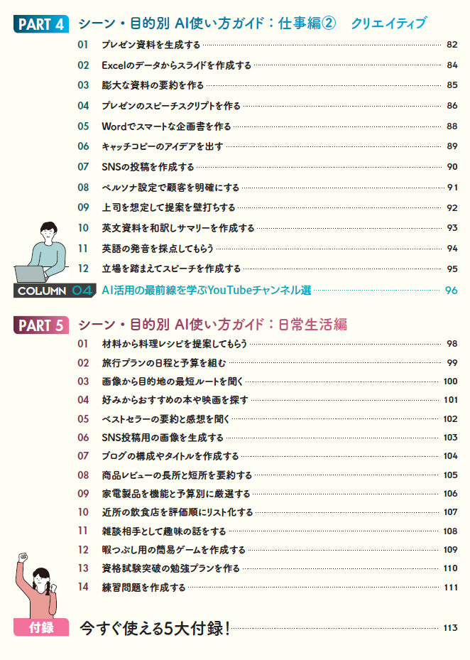 さらにPART3~5では、業務効率化、AIクリエイティブ、日常生活といったシーン別に、