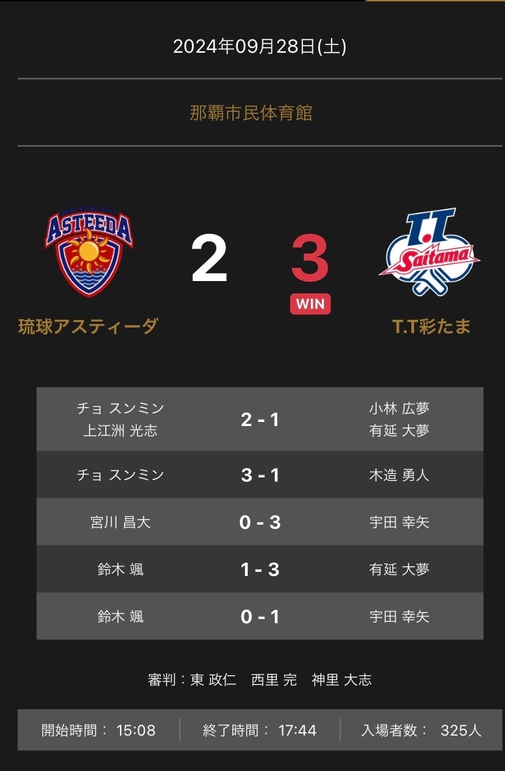 琉球アスティーダとT.T彩たまの試合は、3-2でT.T彩たまが勝利しました。