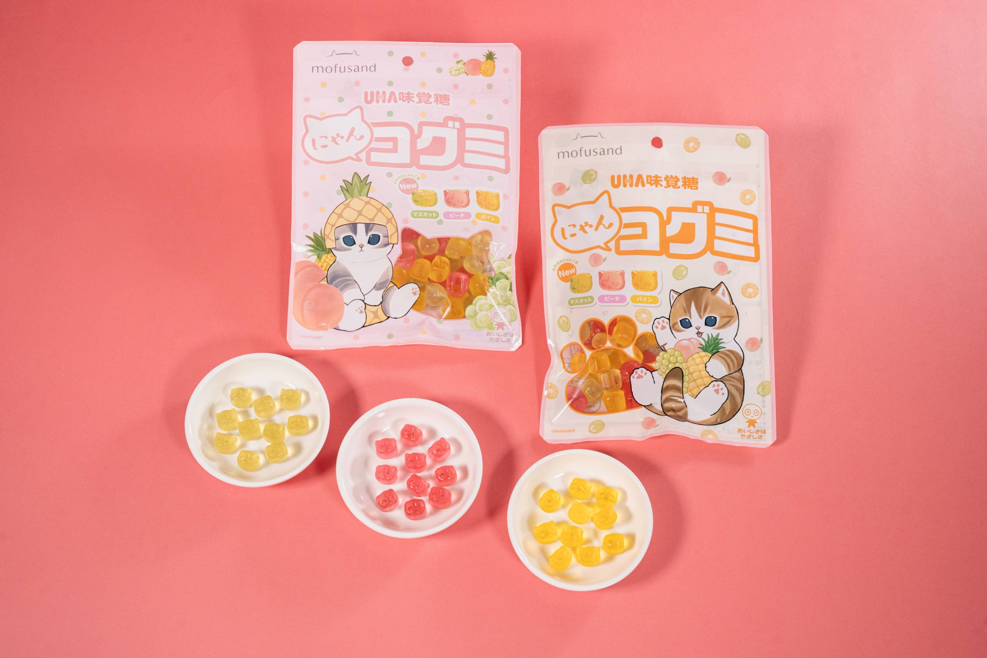 【内容】「mofusand」のにゃんこのお顔を再現したグミです。味はマスカット・ピーチ・パインの3種アソートで、「たちみみ&たれみみにゃんこ」の顔の形が特長です。パッケージは「mofusand」とコラボレーションしたデザインで、全2種類です。※数量限定