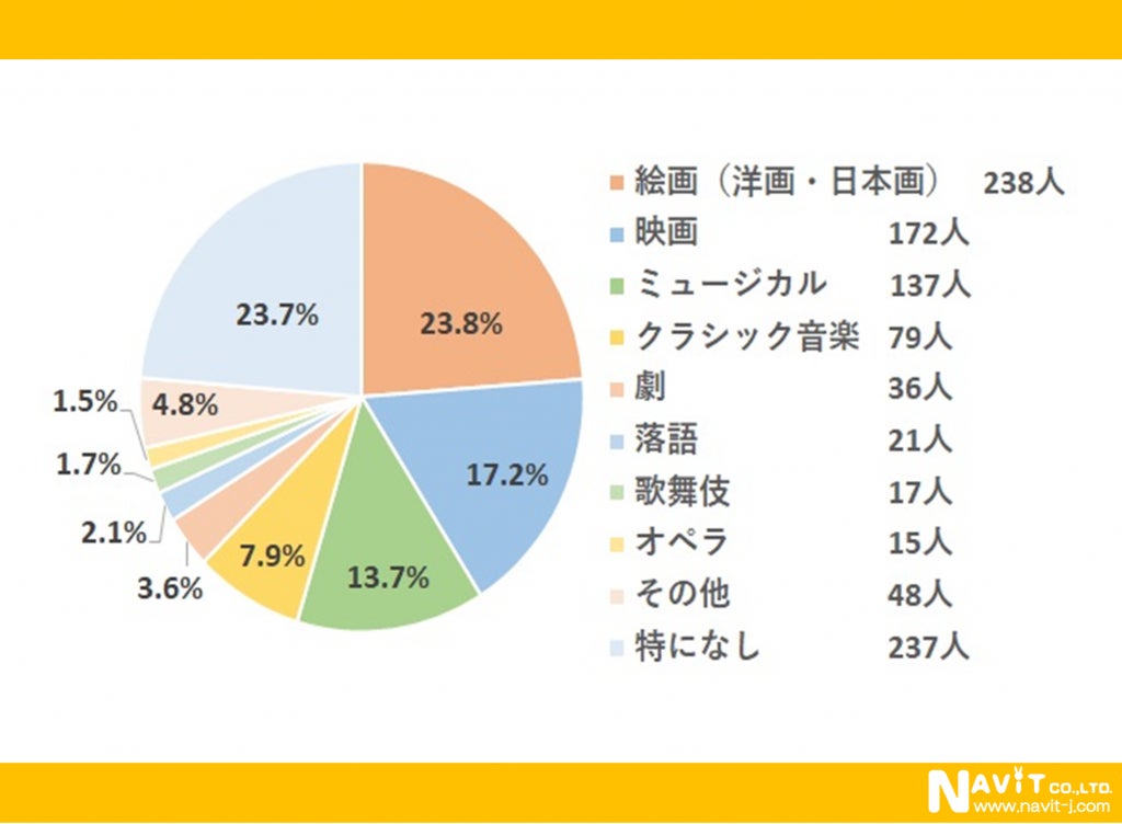 行ってみたい芸術鑑賞のトップは「絵画(洋画・日本画)」で238人。「映画」(172人)、「ミュージカル」(137人)がこれに続きます。