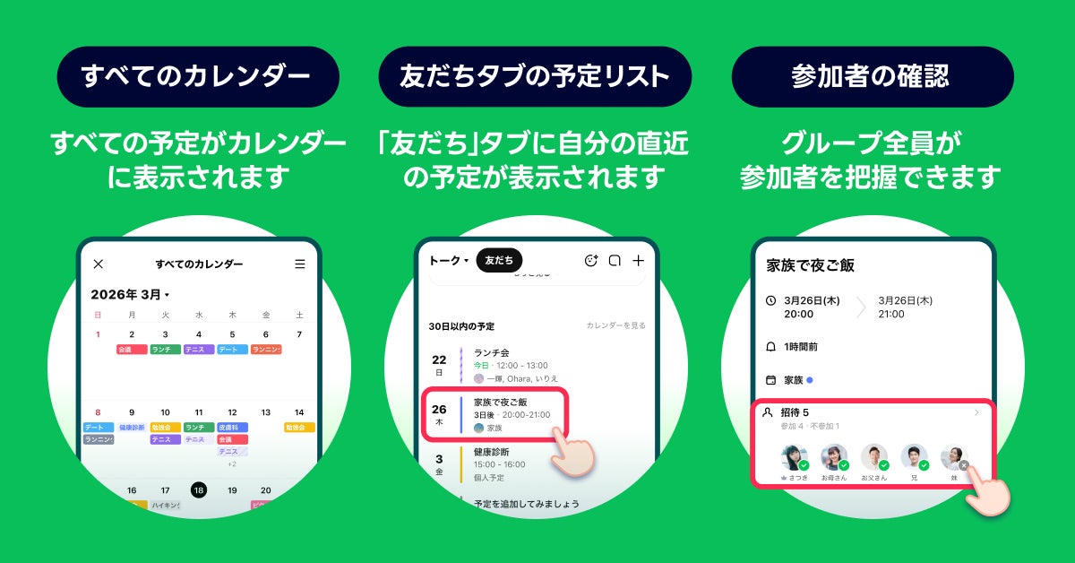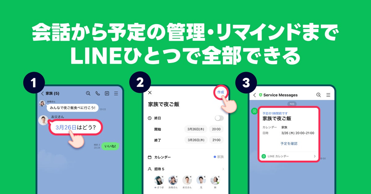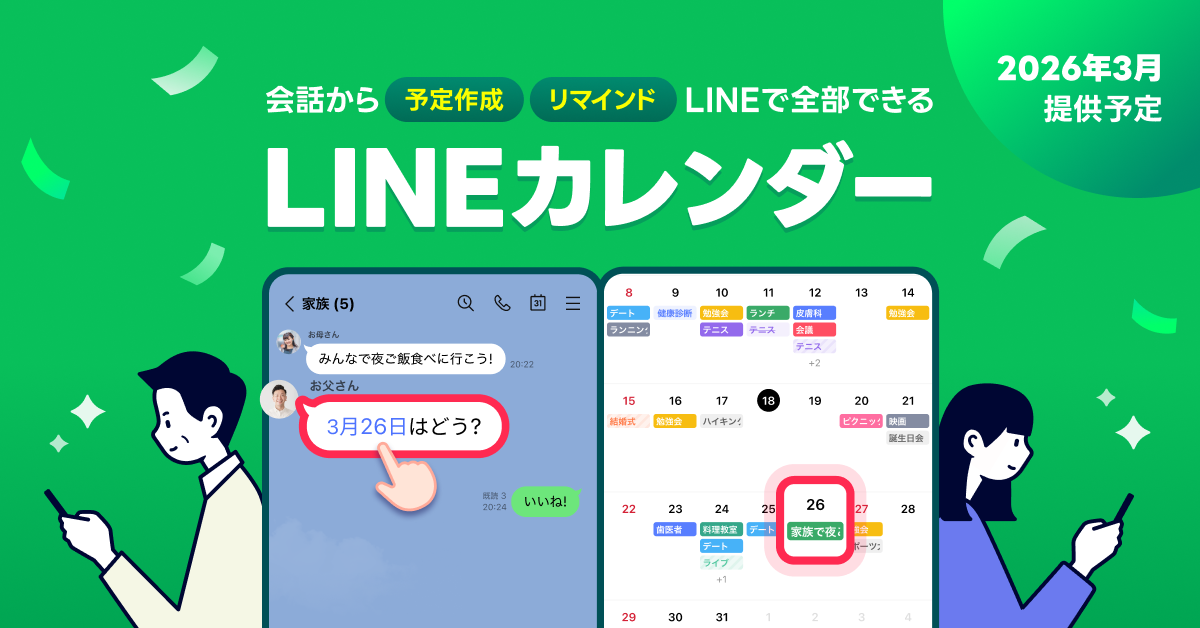 LINEヤフー株式会社(以下、LINEヤフー)は、2026年3月に、コミュニケーションアプリ「LINE」のトークルーム上で予定の作成から管理、リマインドまでを一貫して行える「LINEカレンダー」機能(以下、本機能)の提供を開始する予定です。本機能は、「LINE」上の会話から自然に予定を作成・共有・管理できる新たなカレンダー体験を提供します(※)。