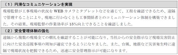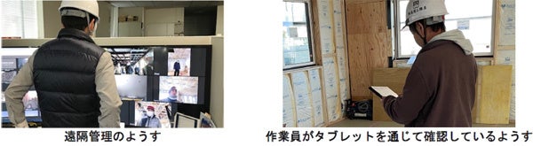 実証実験では、工事現場に設置されたWEBカメラから工事状況や資材の運搬状況のデータを収集し、全国12カ所の事業所に設置した、複数の工事現場を遠隔管理できるシステム「スマートコントロールセンター」から一元管理を行いました。これにより、工事現場監督は現地に行かなくともタブレット端末やモニターなどを通じて、作業員との円滑なコミュニケーション体制の構築が可能となりました。これまでに戸建住宅約3,400棟(※4)の工事現場において試験運用し、現場監督の業務効率を約15%向上でき、長時間労働の抑制につなげることができることを確認しました。