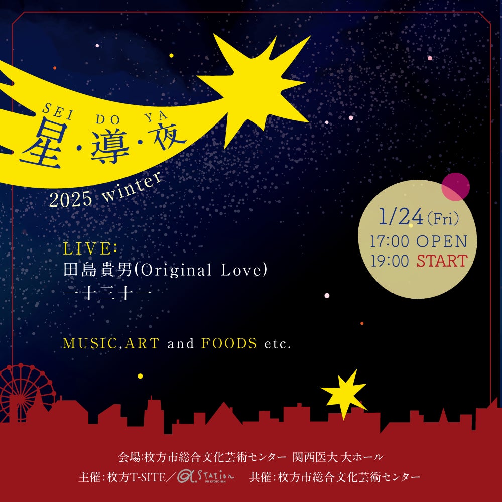 枚方T-SITE(大阪府枚方市)は、2025年1月24日(金)に、音楽、アート、食の祭典「星・導・夜(SEI・DO・YA)2025 Winter」を開催します。4回目となる今回は、京都のFMラジオ局「α-STATION FM-KYOTO」と初めてタッグを組み、ライブに田島貴男さん(Original Love)と、シンガーソングライターの一十三十一さんが登場します。アート・雑貨や飲食、枚方の物産品の販売と併せて、ぜひお楽しみください。
