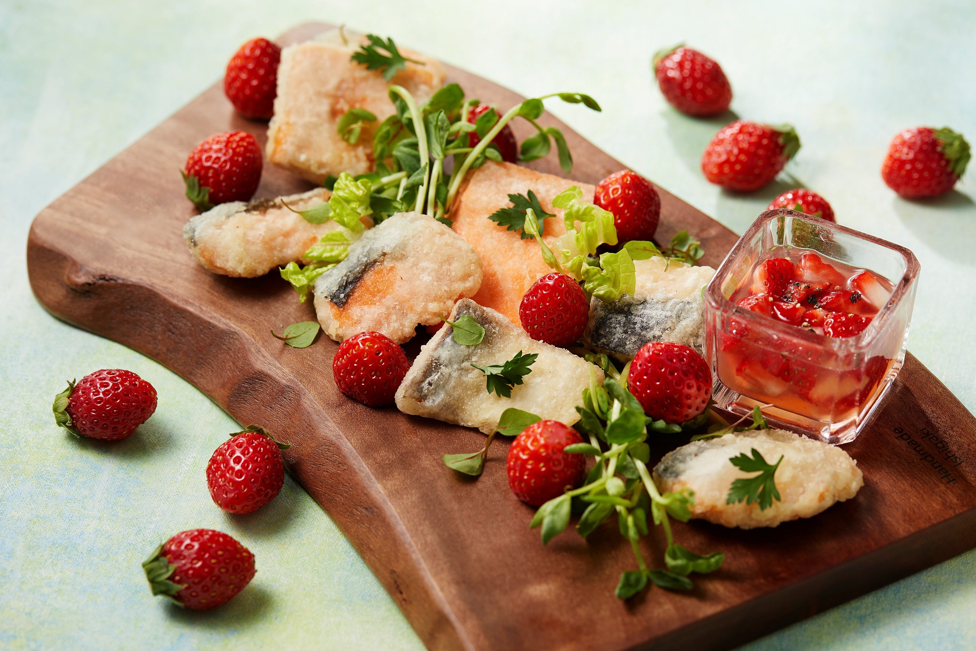 セイボリー:サーモンのベニエ ホワイトバルザミコと苺のヴィネグレットストソース