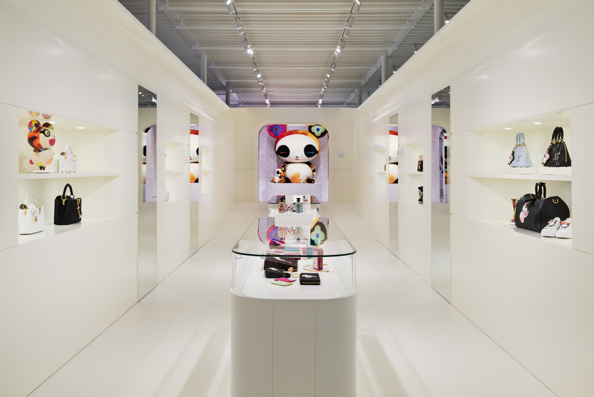 ニュートラルな色調のリテール·スペースでは、カラフルな「モノグラム·マルチカラー」や陽気なキャラクター「スーパーフラット·パンダ」、魅惑的な「スーパーフラット·ガーデン」などの最新コレクションをご覧いただけます。製品のご購入者が体験できるベンディングマシーンも設置。