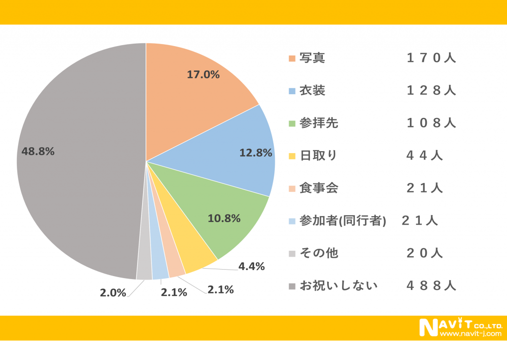 七五三のお祝いで重要視することに対するアンケートで、最も重要だということは「写真」で17.0%でした。次に多かったのは「衣装」で12.8%で「参拝先」が10.8%という結果になりました。イベントで写真を残すというのは優先順位が高いという結果になりました。