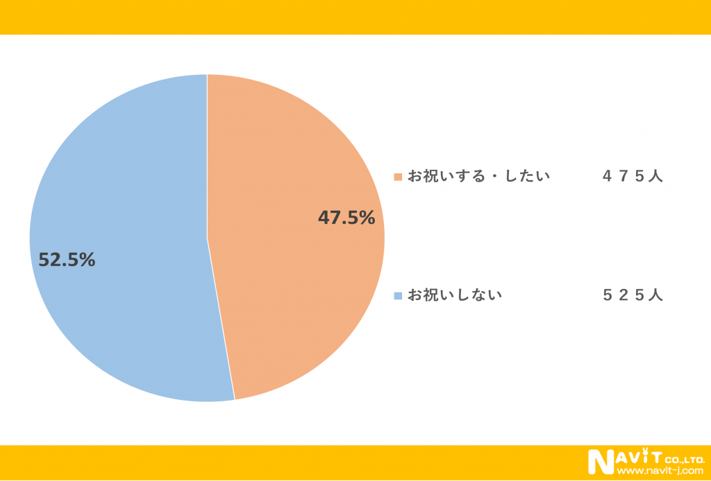 子どもの七五三のお祝いをしますか?というアンケートに対して「お祝いする・したい」と回答された人が47.5%で「お祝いしない」と回答された人が52.5%という結果になりました。