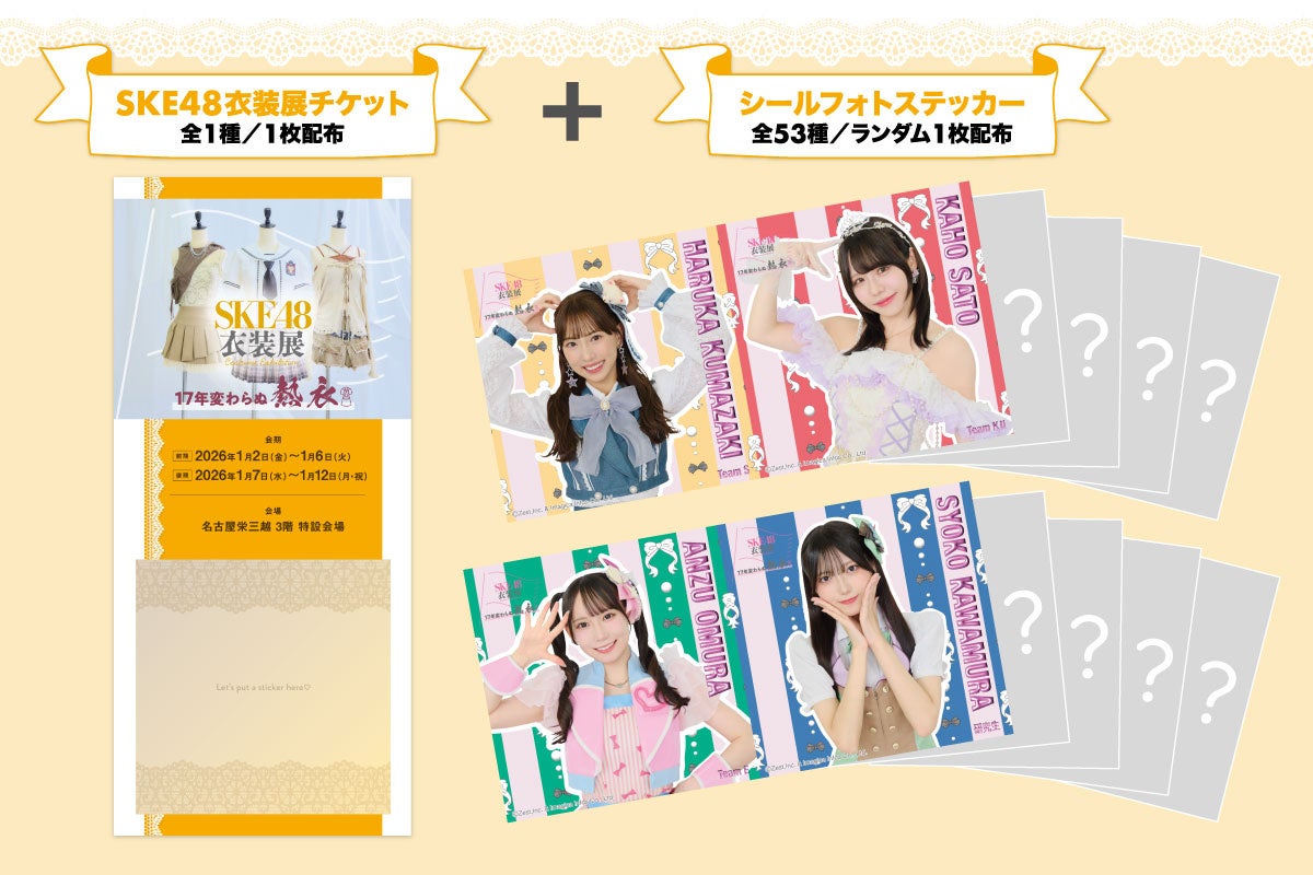 ご入場時にお一人様につき1枚ずつ「SKE48衣装展チケット」と「シールフォトステッカー」をセットで配布いたします。こちらの「SKE48衣装展チケット」は、「シールフォトステッカー」をお好みで貼ることができるカスタム仕様。