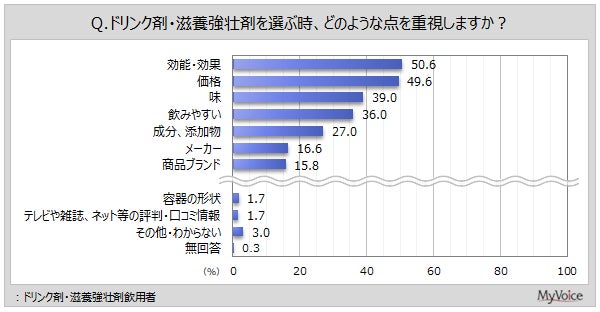 ドリンク剤・滋養強壮剤飲用者の重視点は(複数回答)、「効能・効果」「価格」が各5割前後です。続く「味」は39.0%、10~30代では50%台となっています。