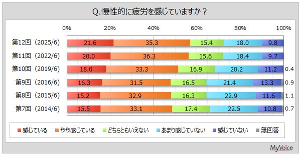 慢性的に疲労を感じている人は、「感じている」「やや感じている」を合わせて6割弱です。男性40~50代では各6割強、女性10~50代では7割前後と高くなっています。