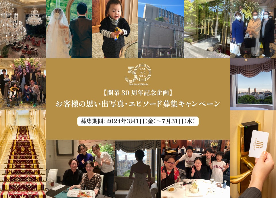 リーガロイヤルホテル東京(東京都新宿区 総支配人 八木 亨)は、2024年5月1日(水)に開業30周年を迎えることを記念し、2024年3月1日(金)から7月31日(水)までの期間中、当ホテルでのご宿泊、お食事、ご結婚式などのお客様の思い出に残っているお写真やエピソードを募集いたします。