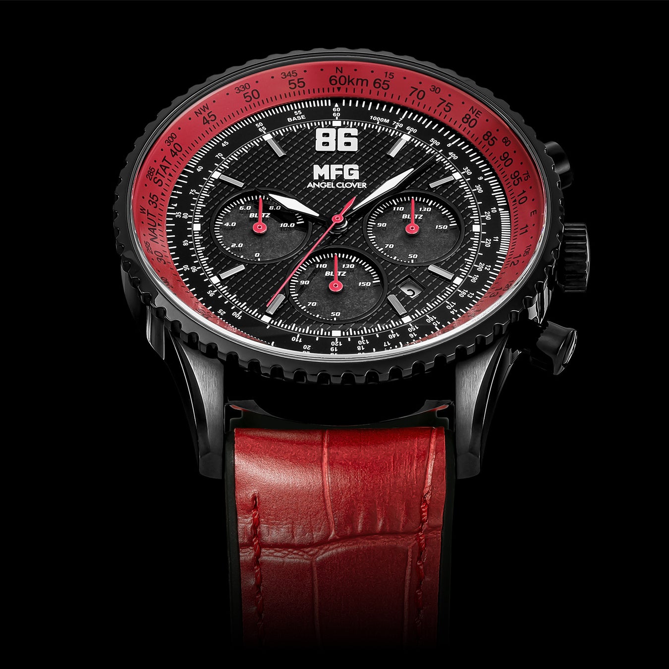 『MFゴースト』の主人公、片桐夏向が乗車する「TOYOTA 86GT」をイメージ。針やベゼル、ストラップ表面を車体と同じレッドカラーで表し、公道で疾駆する姿を彷彿とさせます。一方で、ケース全体は引き締まったマットブラックに。ダイヤル中央には格子状のパターンを取り入れ、「TOYOTA 86GT」の特徴的なフロントグリルを連想させます。12時位置に置かれた「86」も印象的です。
