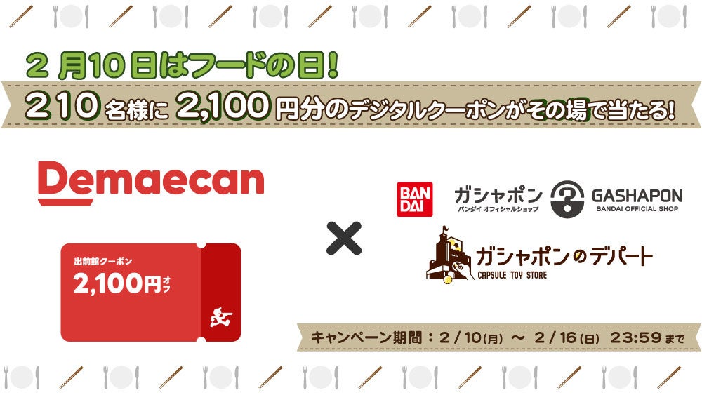 株式会社バンダイナムコアミューズメントが運営するカプセルトイ専門店『ガシャポンバンダイオフィシャルショップ』と『ガシャポンのデパート』は、X(旧ツイッター)の対象アカウントをフォローして応募すると、その場で「出前館クーポン」2,100円分が210名さまに当たるキャンペーンを、2月10日(月)“フードの日”の語呂に合わせ、2025年2月10日(月)から2025年2月16日(日)の期間開催します。