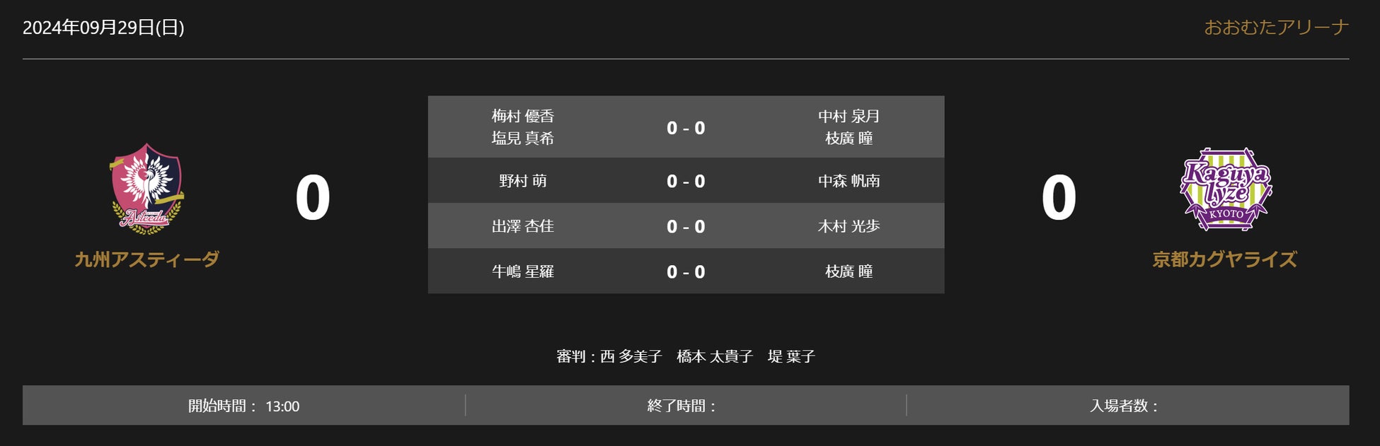 ノジマTリーグ 2024-2025シーズン 公式戦 9月29日開催 九州アスティーダ vs 京都カグヤライズ 対戦オーダー発表