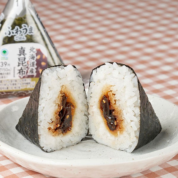 【内容】北海道産の真昆布を使用した昆布の佃煮を包んだおむすびです。昆布を炊いた後に再度醤油を混ぜることで醤油の風味と甘辛い味わいが感じられる佃煮に仕上げています。小さめにカットした昆布を多く入れることで、味の広がりが増すよう変更しました。