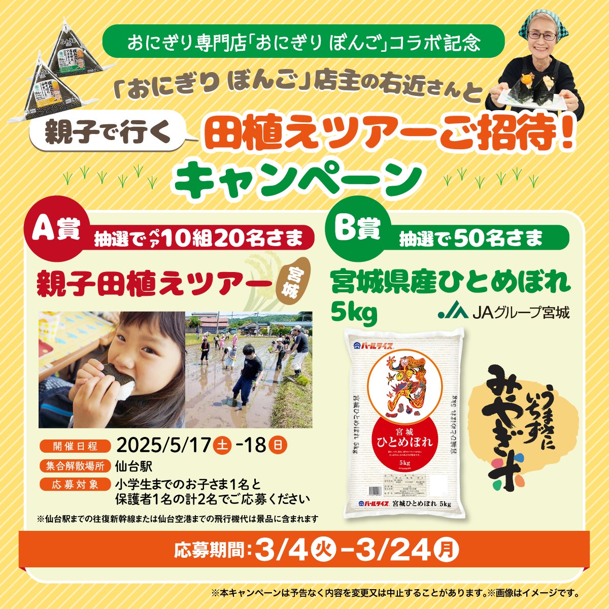 ぼんご監修のおむすびの発売を記念し、「おにぎり ぼんご」店主の右近さんと行く親子田植えツアーや宮城県産ひとめぼれ5kgを抽選で合計50名様にプレゼントするキャンペーンを実施いたします。