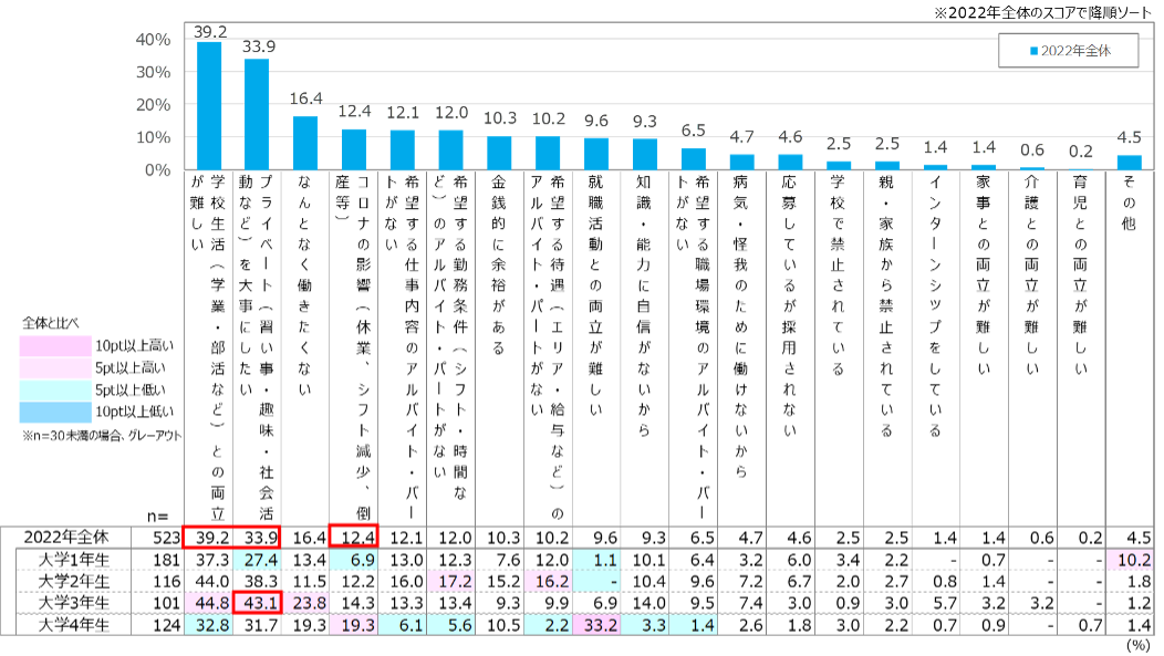 ※ベース:現在アルバイト非就業の大学生(2022年で降順)