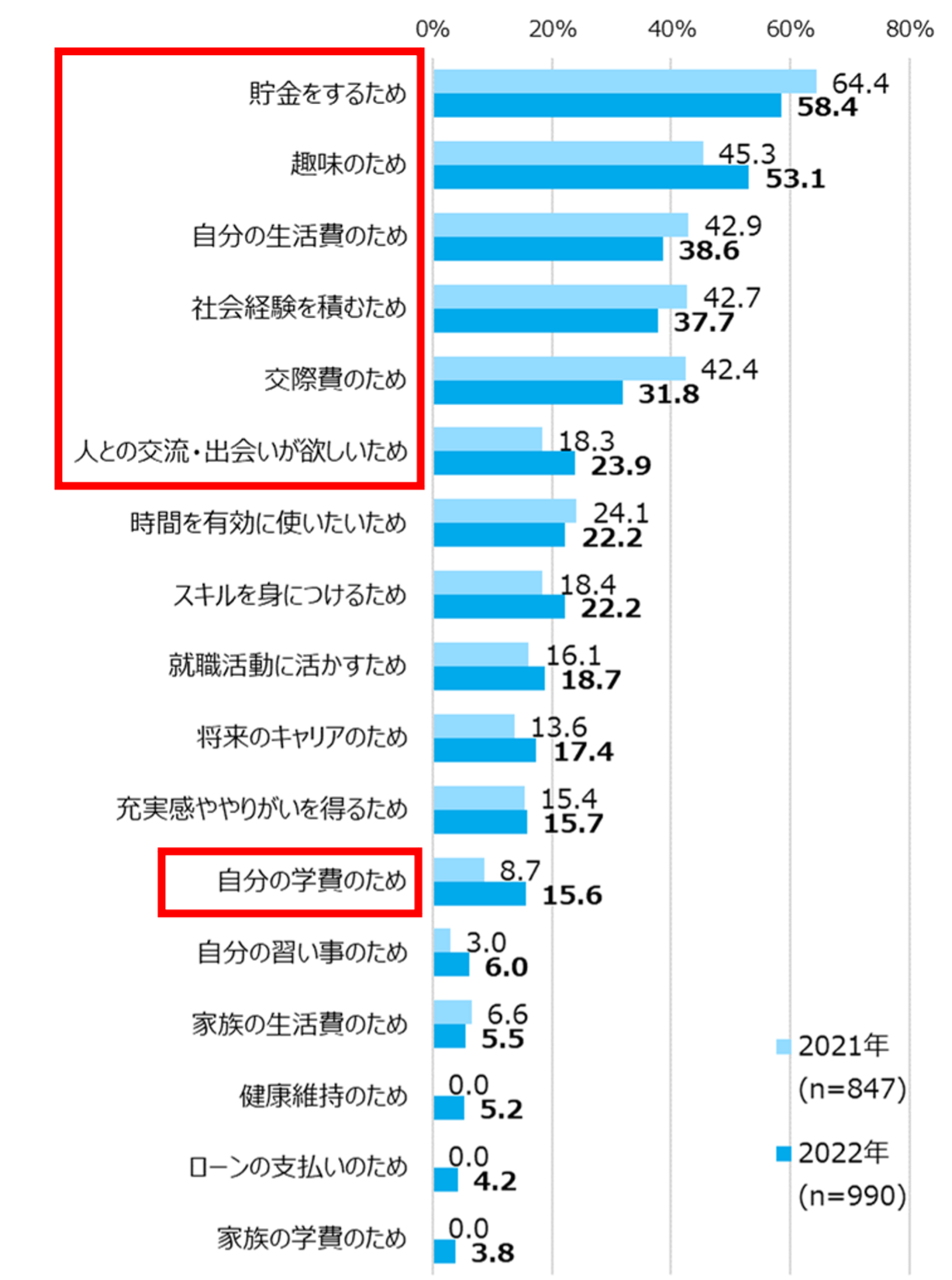 大学生のアルバイトの目的は「交際費のため」が前年より10.6pt減り、「趣味のため」「自分の学費のため」「人との交流・出会いが欲しいため」が増加