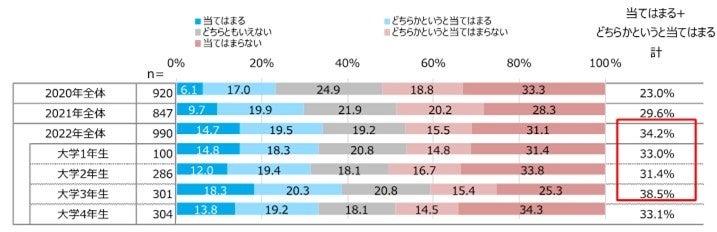 就職活動を意識してアルバイトをする大学生は34.2%で前年比4.6pt増加した。コロナ禍で学生生活が制限されるなか、アルバイトを通して就職活動でアピールできる経験を得たいと考える学生が増加したとみられる。学年別では、就職活動を控えた大学3年生が38.5%と最も高いが、大学1年生では33.0%、大学2年生では31.4%と低学年でも約3割が就職活動を意識してアルバイトをしていることがわかる。【図3】