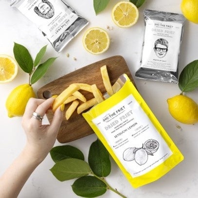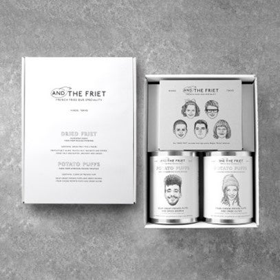 東京・広尾のフレンチフライ専門店〈アンド ザ フリット〉が開発した、ベルギー産ポテトの“サクサク食感”のプレミアムスナック「ドライフリット」。(上)ベルギー産ポテトの黄色の果肉としっかりしたうまみを活かしたドライフリットに、瀬戸内産(広島県/愛媛県産)の国産レモンのパウダーをまぶしました。(下)話題の新作パフスナックと5種類のミニサイズのドライフリットが入ったおすすめセット。