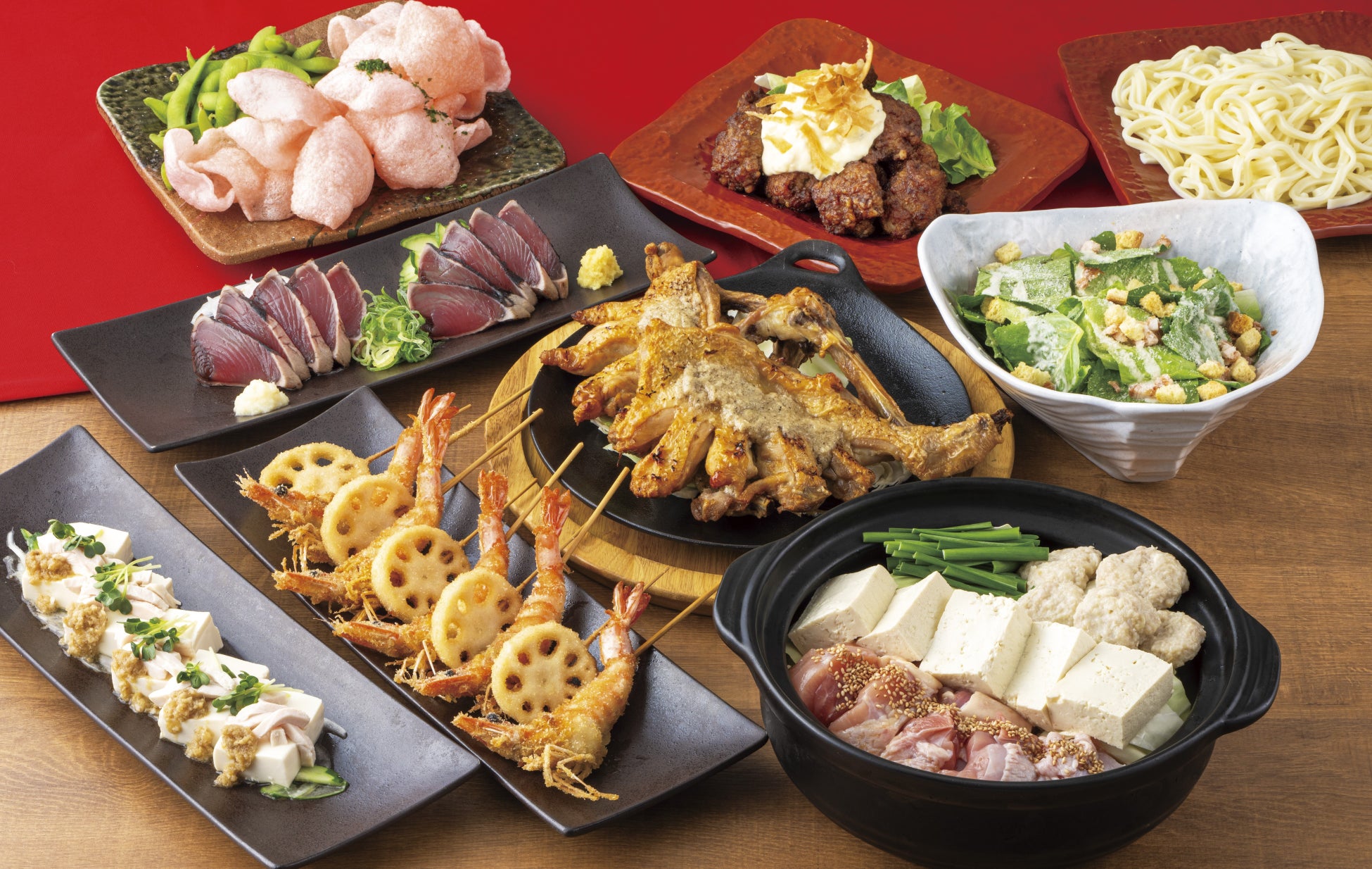 清流若どりの水炊き鍋、名物デカもも1本焼き、串揚げ盛合せにカツオのタタキなど