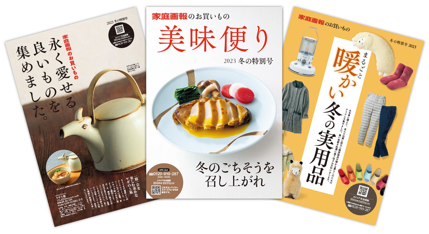 「本物」の商品のみを追求し、高価格帯ながら毎号完売商品が続出している「家庭画報ショッピングサロン」の通販。2023冬の特別号では『美味便り』、『永く愛せる良いものを集めました。』、『まるごと暖かい冬の実用品』など計9カタログを発行しました。電話とインターネット( https://shop.sekaibunka.com/ )でご注文いただけます。各カタログは、以下のオンラインカタログからもご覧いただけます。