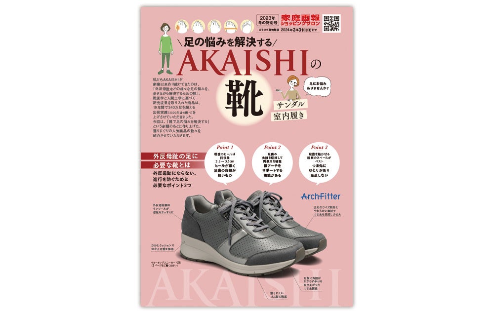 『足の悩みを解決するAKAISHIの靴』では外反母趾などさまざまな足の悩みを解決する靴をご紹介しています。スニーカー、ブーツ、サンダルまで、シーンに合わせてお選びください。