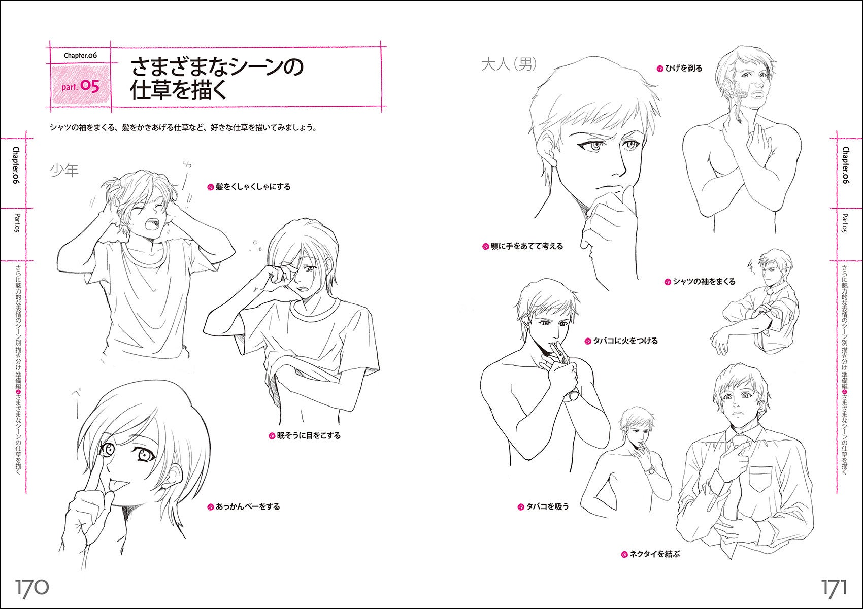 恋愛シーンや、仕事のシーンなど、マンガやアニメーションで描きたい14のシーンを収録しています。