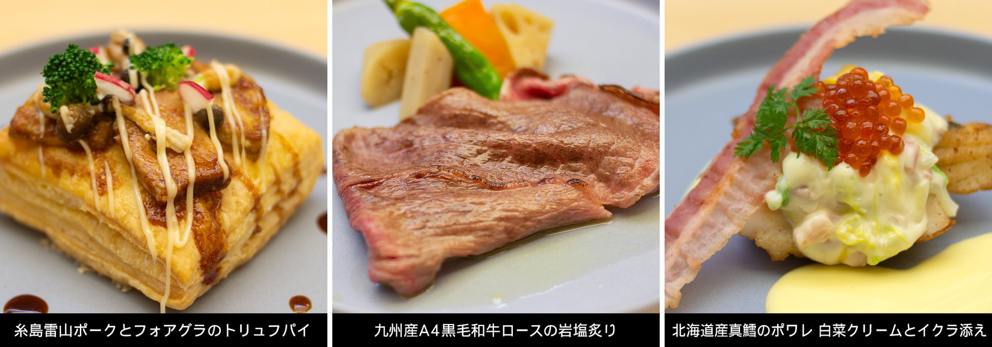 オリエンタルホテル福岡 博多ステーション(所在地:福岡市博多区)のB2F / Restaurant LINK SQUAREにて開催している「LINK SQUARE LUNCH BUFFET」では、2025年1月2日(木)より料理メニューを一新いたします。セミブッフェスタイルで楽しめる本ランチでは、3種類のメイン料理からお好みの1品をお選びいただけます。お客様の目の前で、上質な九州産黒毛和牛をヒマラヤ岩塩の上で直火で炙って仕上げる「九州産A4黒毛和牛の岩塩炙り」、糸島のブランド豚 雷山(ライザン)豚の角煮とフォアグラ、トリュフを使ったパイを醤油ベースの和風テイストに仕上げた「糸島雷山ポークとフォアグラのトリュフパイ」、冬場に旬を迎える真鱈をバターでゆっくりと焼き上げ、白菜のクリーム煮にイクラを贅沢に添えた「北海道産真鱈のポワレ白菜クリーム~イクラを添えて~」、これら3種類のメイン料理をシェフが自信をもってご提供いたします。
