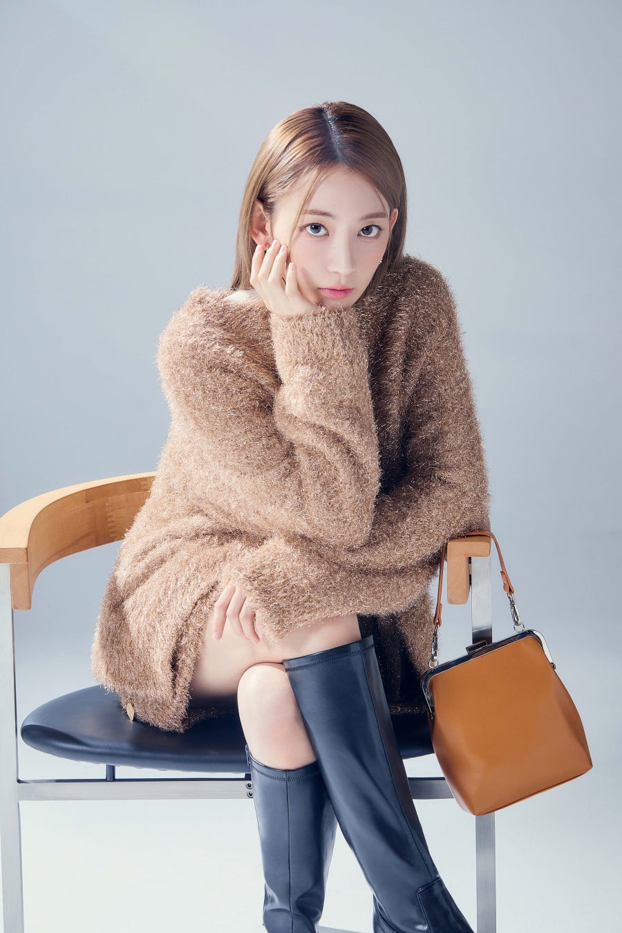 ラメ糸やビジューのボタン、シャイニーなバッグなど、煌めくひとさじをさりげなく添えクラスアップした装いを、宮脇咲良が可憐に纏う。
