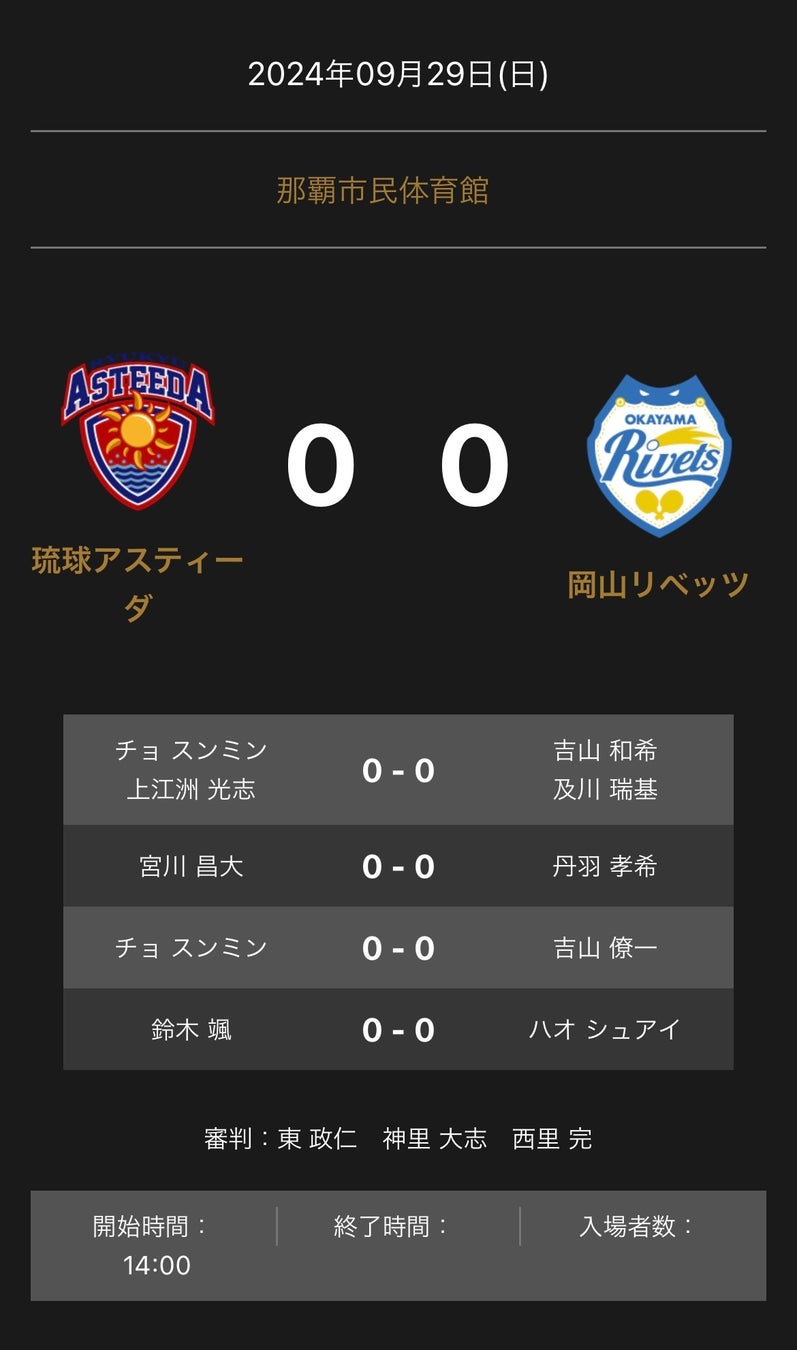 ノジマTリーグ 2024-2025シーズン 公式戦 9月29日開催 琉球アスティーダ vs 岡山リベッツ 対戦オーダー発表