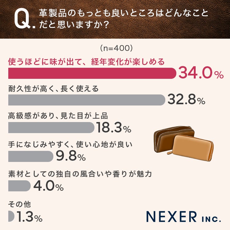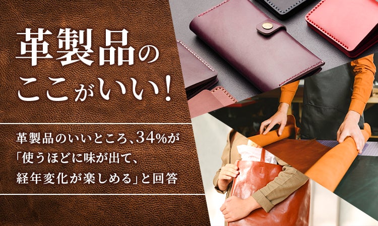 【革製品のここがいい!】革製品のいいところ、34%が「使うほどに味が出て、経年変化が楽しめる」と回答