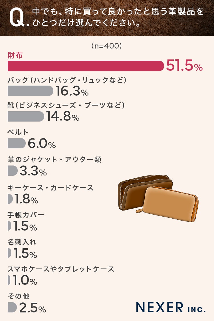 ■51.5%が、とくに使ってよかったと思う革製品は「財布」