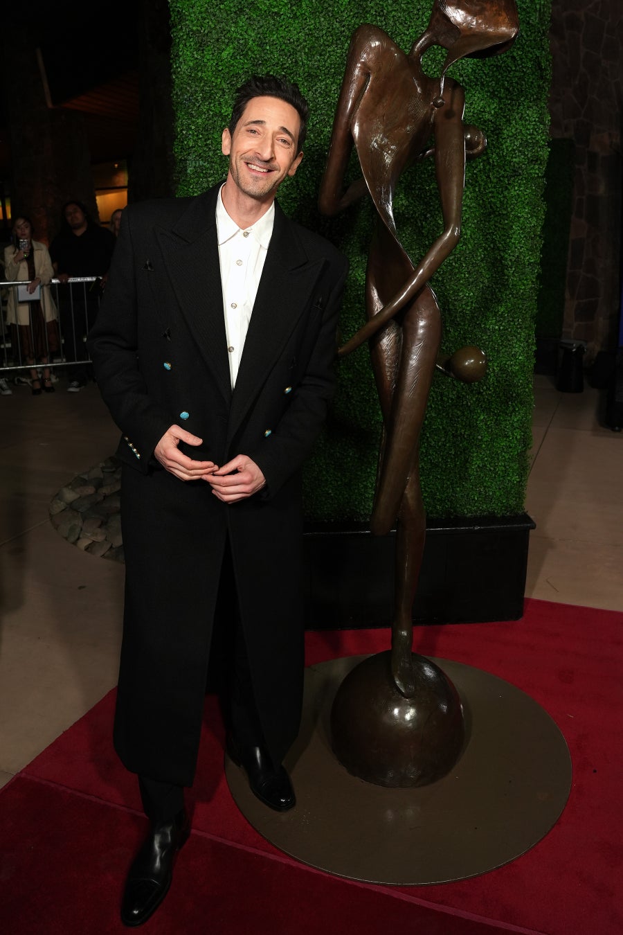 エイドリアン·ブロディは、ブラックのダブルブレストコートに、ホワイトシャツ、ブラックのパンツ、ブラックのチェルシーブーツを合わせました。