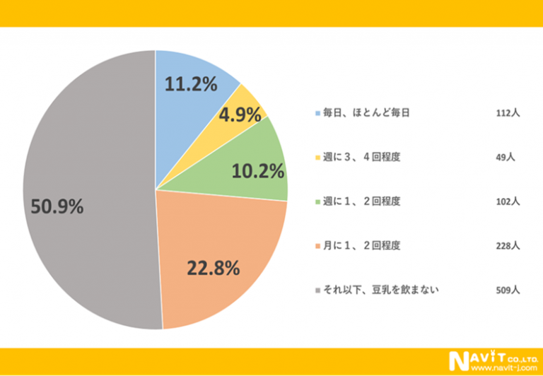 豆乳を飲む頻度では「月に1、2回程度」と答えた人が22.8%で、僅差ではありますが「毎日、ほとんど毎日」という人が11.2%と2番目で、3番目は「週に1、2回程度」で10.2%という結果になりました。