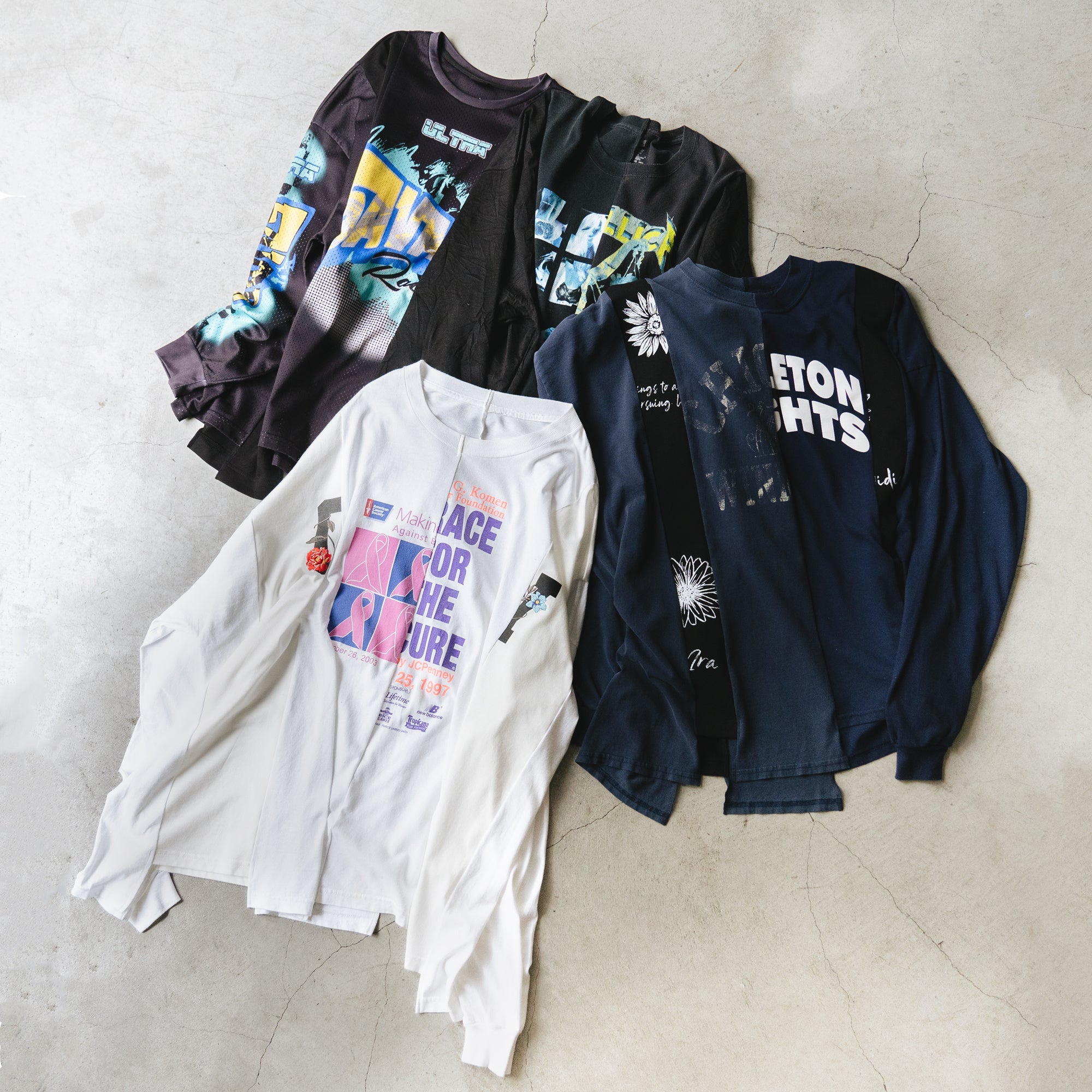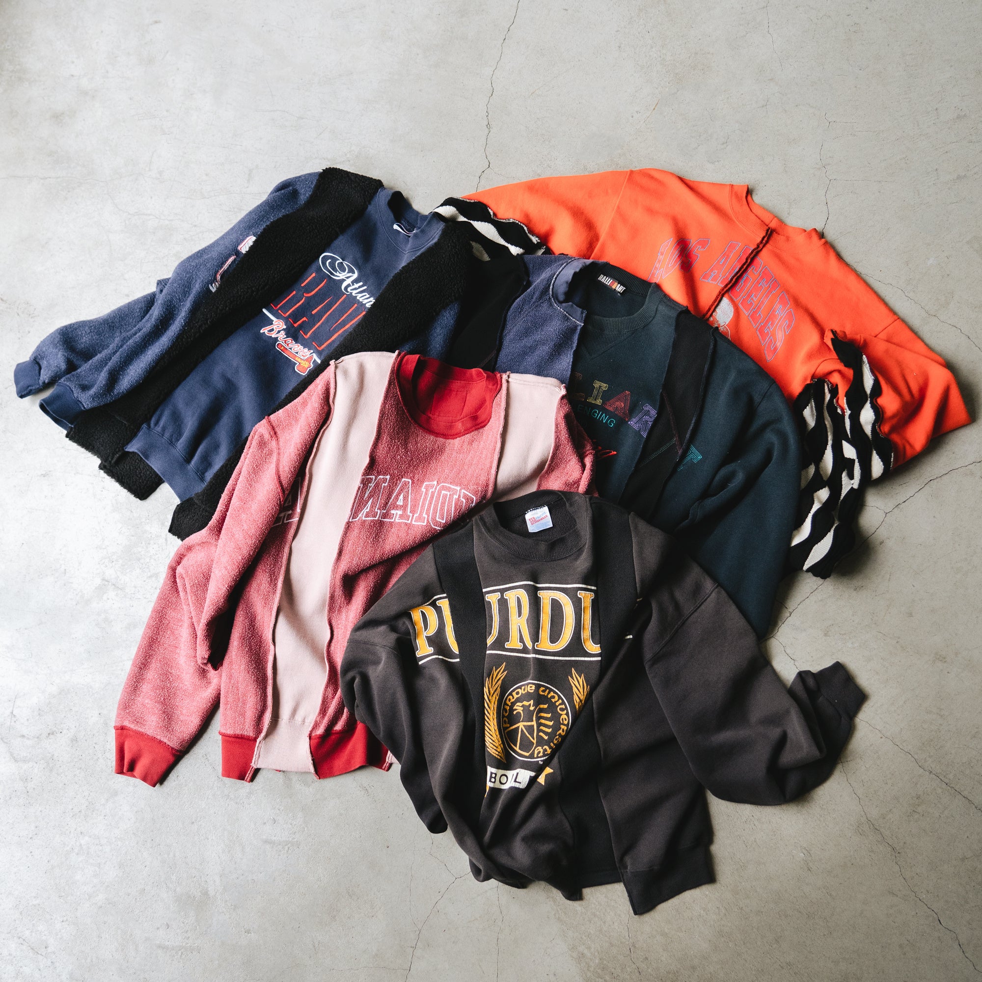 今回は同じく“再利用”という概念から古着屋とのコラボレーションを実施。サンプルと古着をリメイクした1点物のロンTとスウェットを販売いたします。