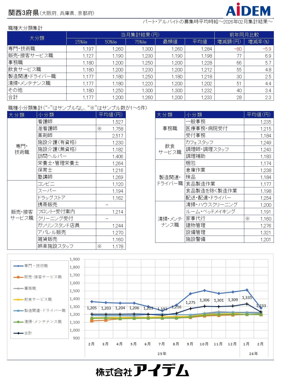 職種大分類別の平均時給は、「専門・技術職」1,284円(前年同月比80円減)、「事務職」1,228円(同66円増)、「製造関連・ドライバー職」1,218円(同30円増)、「飲食サービス職」1,212円(同55円増)、「清掃・メンテナンス職」1,202円(同51円増)、「販売・接客サービス職」1,198円(同77円増)の順で、前年同月比でプラスが5職種、マイナスが1職種となった。府県別の平均時給は、大阪府1,257円(前年同月比18円増)、京都府1,216円(同35円増)、兵庫県1,198円(同41円増)の順となり、前年同月比で全ての府県がプラスとなった。