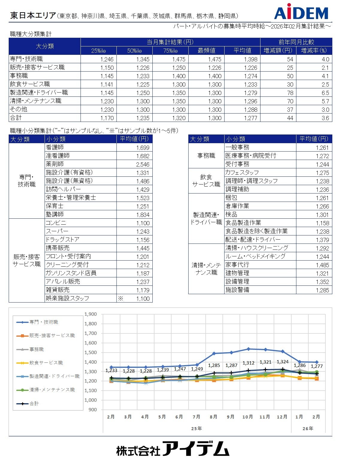 総合人材情報サービスの株式会社アイデム(本社:東京都新宿区 代表取締役社長:椛山 亮)は、求人メディア『イーアイデム』や採用ホームページ構築サービス『Jobギア採促』を利用して公表された求人情報から、2026年2月のパート・アルバイト募集時平均時給を集計いたしました。