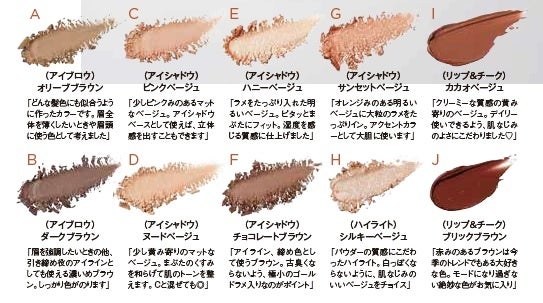 アイブロウ、アイシャドウ、ハイライト、リップ&チークとして使える10色は、