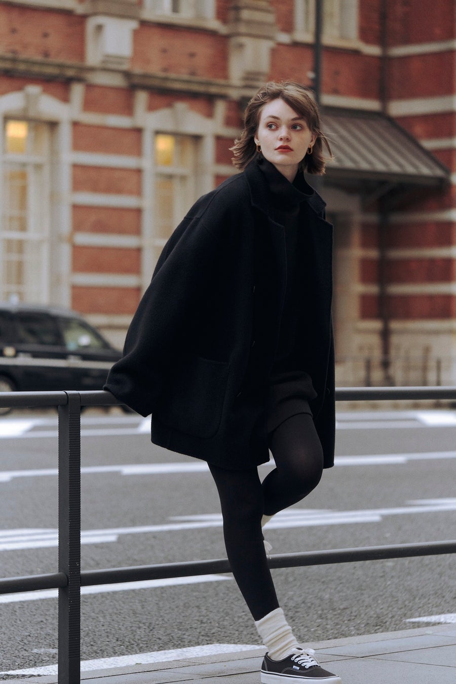 肩剥ぎのディテールを追加することで重さを感じない着心地へ改良しインラインやアーカイブに存在しないタートルネックディテール。折り返さず自 然に立ち上がるバランスが最大の特徴。