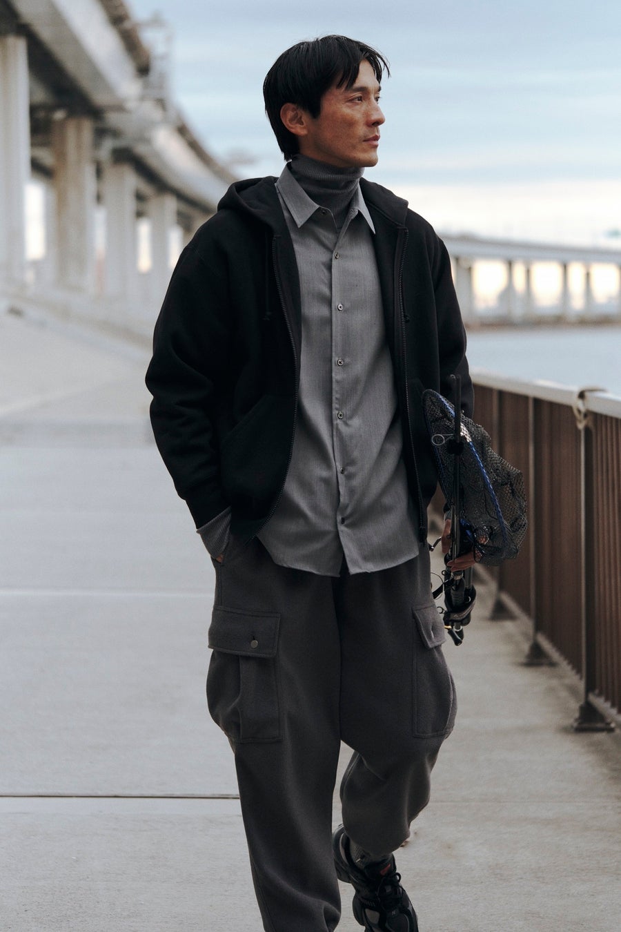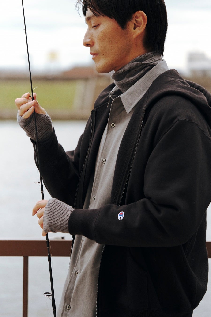 アウター用ファスナーを採用し、ダークネイビーにはシルバー、ブラックにはファスナーも黒染めをそれぞれ 変更。 春にはアウターとしても着用出来るようフードバランスやネック周囲サイズも細かく調整しインナー、アウターの2wayとなるサイズバランスを追求。