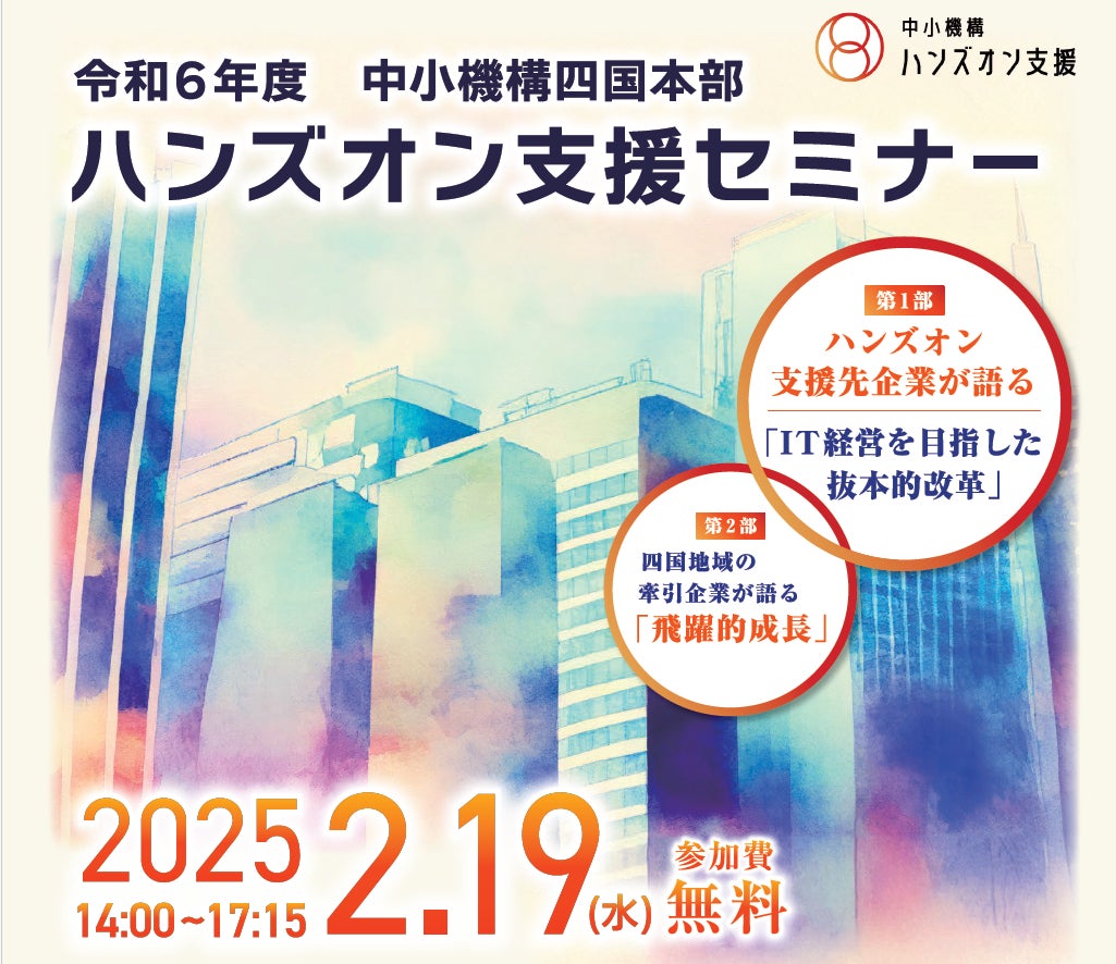 中小機構(独立行政法人中小企業基盤整備機構)四国本部は、ハンズオン支援活用企業が成果と未来に向けた取組を紹介する「令和6年度 中小機構四国本部 ハンズオン支援セミナー」を2月19日(水曜)に開催します。