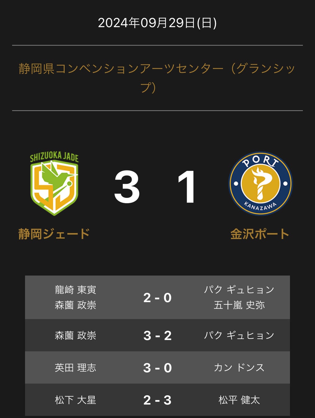 ノジマTリーグ 2024-2025シーズン 公式戦9月29日開催 静岡ジェード vs 金沢ポートの試合は、3-1で静岡ジェードが勝利しました。