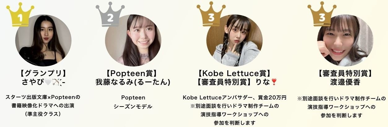 本企画は、「この1冊が、わたしを変える。」をコンセプトとするスターツ出版文庫(以下、「スタ文」)と、ティーン向けファッション誌「Popteen」がコラボレーションした、読者参加型の企画です。1500票にのぼる読者投票によって「映像化してほしいスタ文作品」の第1位に選ばれた「一瞬を生きる君を、僕は永遠に忘れない。」(冬野夜空 著)のキャストオーディションを、ライブ配信アプリmystaにて開催。約2,300名以上が参加したキャストオーディションの結果、「さやぴ」さんがグランプリに選ばれ、オリジナルミニドラマへの出演が決定しました。また、「Popteen賞」を受賞した「我藤なるみ」さんはPopteenシーズンモデルに、「Kobe Lettuce賞」と「審査員特別賞」を受賞した「りな」さんはKobe Lettuceアンバサダーに就任しました。同じく「審査員特別賞」を「渡邉優香」さんが受賞しました。