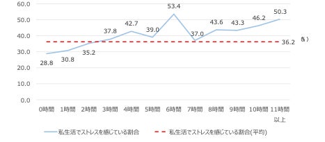 性別・世帯別で22年3月時点で就業していた人の1週間の家事・育児時間について聞いたところ、平日と休日の家事・育児時間を合わせた総家事時間は、全体では19.1時間だった。属性別で最も家事時間が長いのは「配偶者と子どものいる世帯の女性」で36.2時間であった。私生活にストレスを感じている人の割合をみると、全体平均は36.2%であったが、休日1日の平均家事・育児時間別に見ると、家事・育児時間が2時間を超えるとストレスを感じる人の割合は平均を超え、6時間で最も高い結果(53.4%)になった。【図3、4】