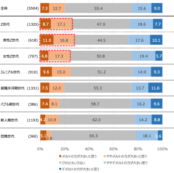 また、Z世代の「余計な人付き合いをしなくていいから(39.1%)」は全体よりも低く、Z世代女性では「仕事に集中できるから(31.6%)」が全体比で高くなった。【図2】