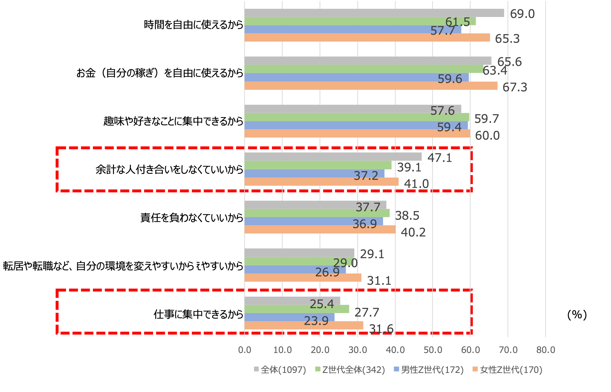 メリットの理由を聞くと、Z世代全体では「お金を自由に使えるから(63.4%)」が最も高く、次いで「時間を自由に使えるから(61.5%)」「趣味や好きなことに集中できるから(59.7%)」が続いた。