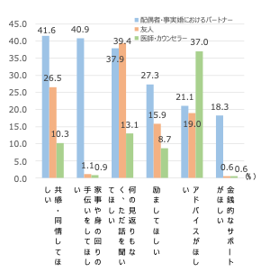 家事・育児時間が比較的長くなる既婚者に、私生活でサポートを得たい人を聞くと、「配偶者(85.6%)」「友人(62.2%)」「医師・カウンセラー(51.5%)」の順となった。また、サポートして欲しい内容を聞くと、配偶者に対しては「共感・同情して欲しい(41.6%)」、友人は「何も聞かずただ話を聞いて欲しい(39.4%)」、医師・カウンセラーでは「アドバイスがほしい(37.0%)」がそれぞれトップとなり、相談相手により求める内容の違いが見られた。【図5-1、5-2】
